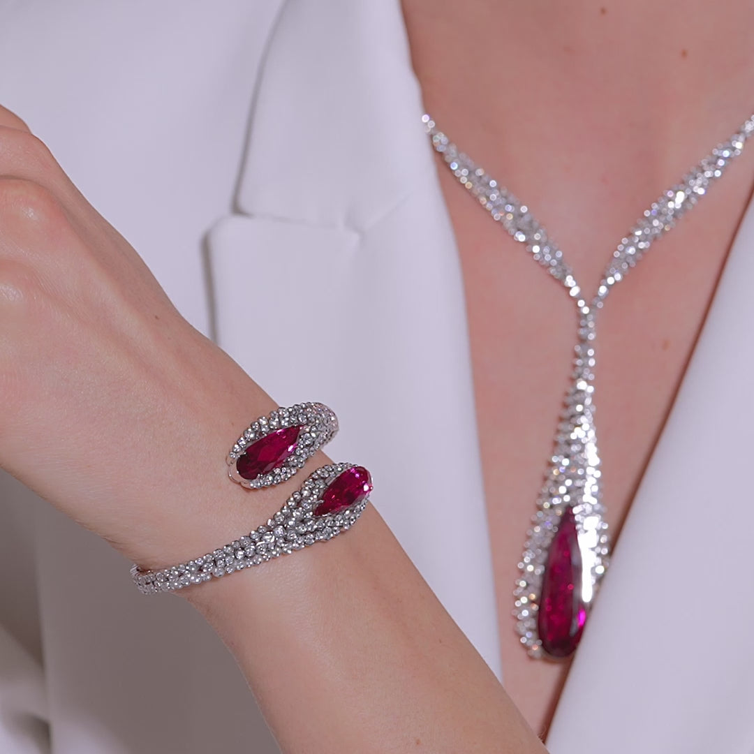 Incanto bangle by Palmiero, featuring white diamonds and a central rubellite on white gold.