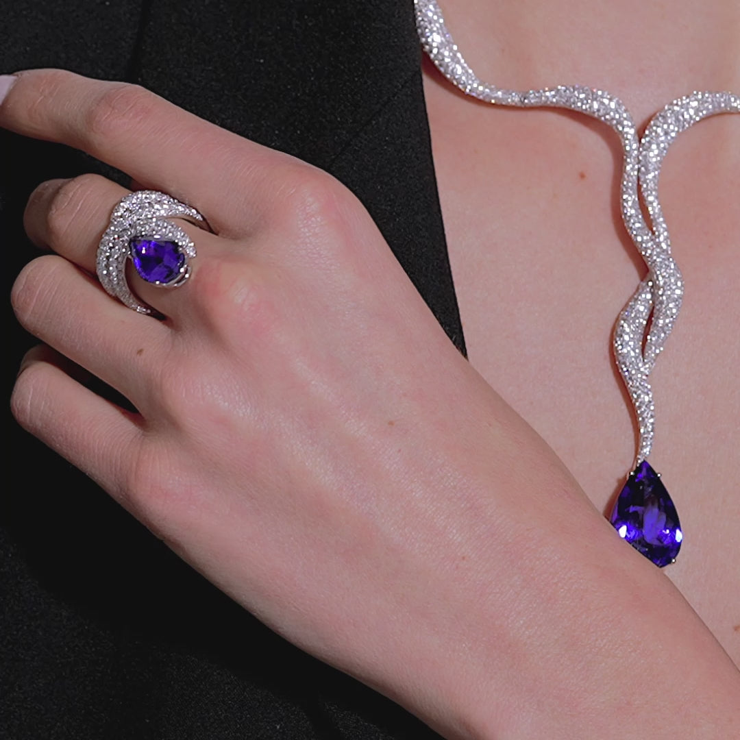 Venere ring by Palmiero, featuring white diamonds and a central tanzanite on white gold.